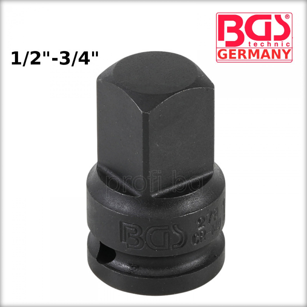 Адаптер / преход усилен от 1/2" към 3/4″ Подходящ както за ударни, така и за ръчни инструменти се фиксира се на инструмента чрез щифт и О-пръстен материал: стомана хром молибден макс. капацитет 580 Nm тегло: 180g