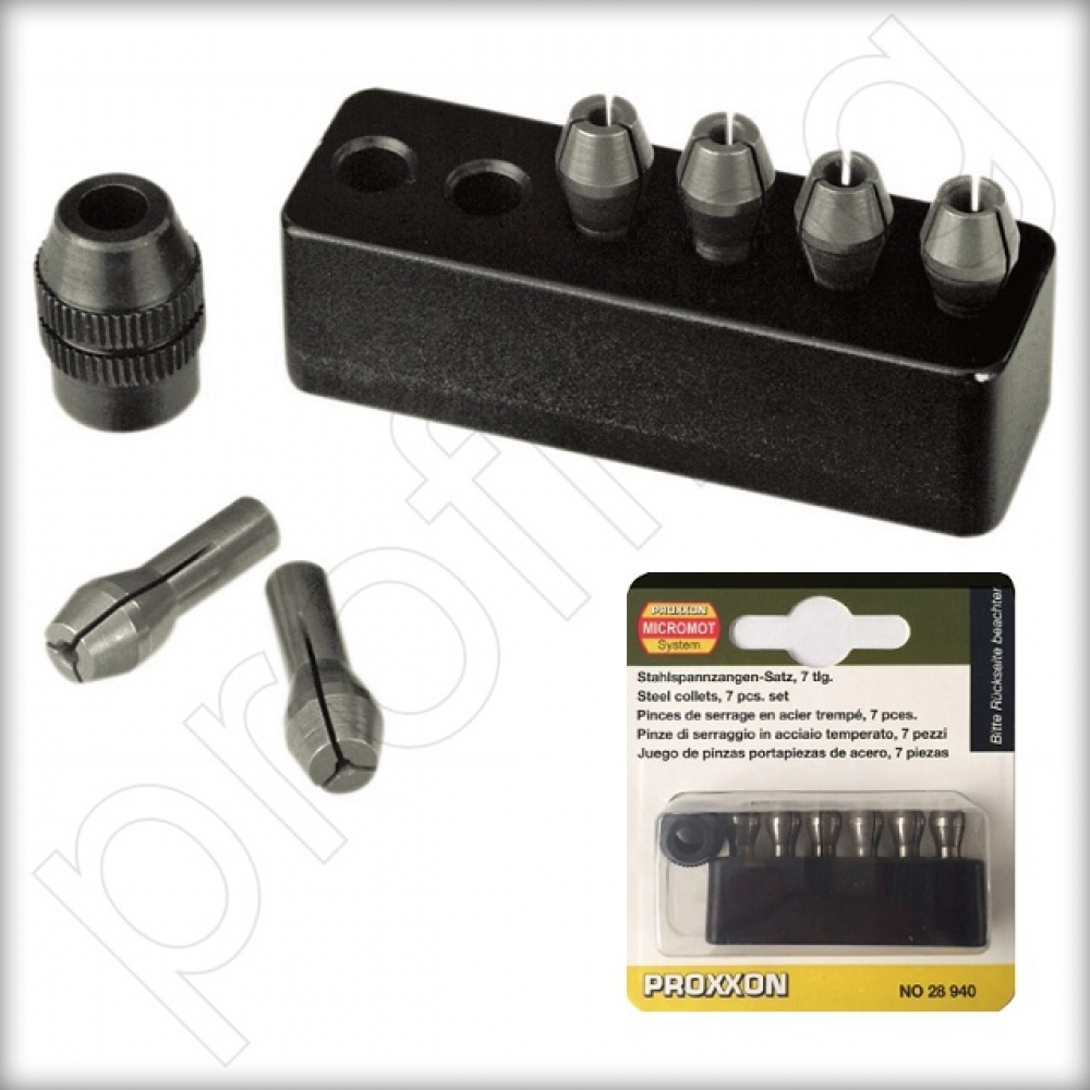Цангите PROXXON MICROMOT са изработени от закалена стомана и притежават необходимата гъвкавост за здраво захващане на работните накрайници. Дори при продължителна употреба, те запазват прецизната си точност. Тези цанги не бива да се сравняват с незакалените четворно разцепени цанги от месинг и алуминий - тройноразцепените цанги са значително по-трудни за производство, но осигуряват много по-добра носеща повърхност, което е особено важно за инструменти с малък диаметър на захвата. Подходящи за шлифовалка IB/E, дрелка LB/E, бормашина ъглова WB, шлифовалка/дрелка FBS 240/E, дрелка FBS 12/E, дрелка 50/ЕF.