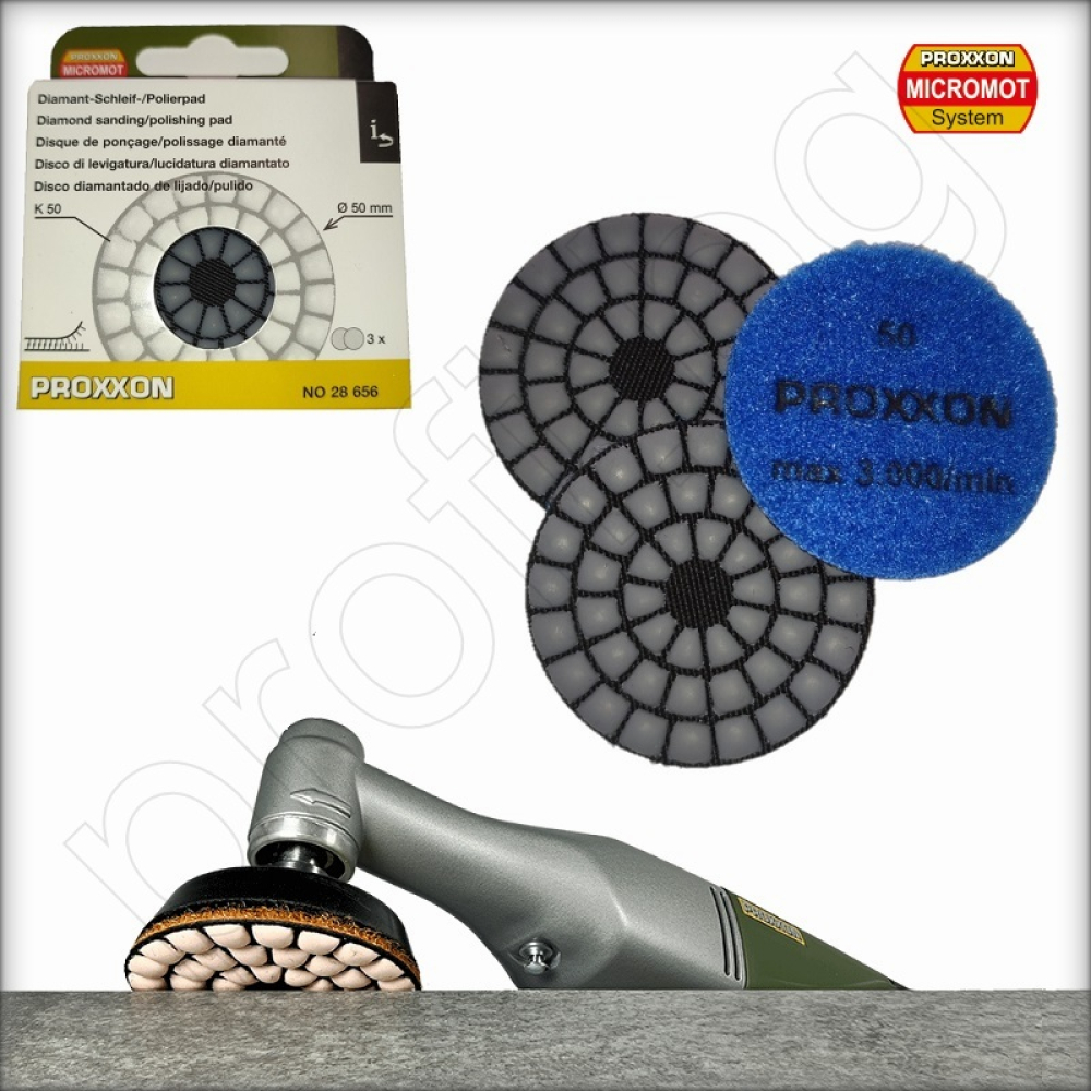 Самозалепващи се полиращи дискове PROXXON MICROMOT за полираща машина, предназначени за скосяване на ръбове, шлайфане и полиране на гранит, мрамор, каменинови и керамични материали.