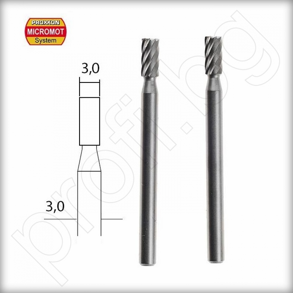 Фрезери 3 mm PROXXON MICROMOT, от волфрам-ванадиева стомана, изработени от една цяла заготовка. Предназначени за меко и твърдо дърво, алуминий, месинг и нелегирана стомана. За да постигнете максимална точност при работа е препоръчително да използватe стоманени цанги PROXXON MICROMOT.