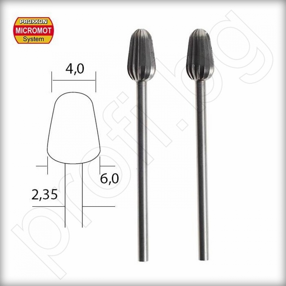 Фрезери 4 мм PROXXON MICROMOT, от волфрам-ванадиева стомана, изработени от една цяла заготовка. Предназначени за работа по меки и твърди дървесини, цветни и благородни метали, пластмаса, гипс. За да постигнете максимална точност при работа е препоръчително да използвате стоманени цанги PROXXON MICROMOT