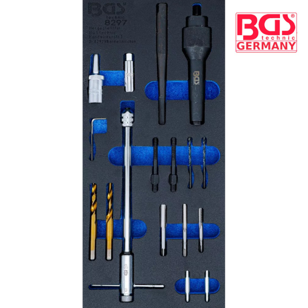 Преправя резбите на свещите, с включените в комплекта метчици със следните размери:M8x1,0, 10x1,0, 1/4"-28