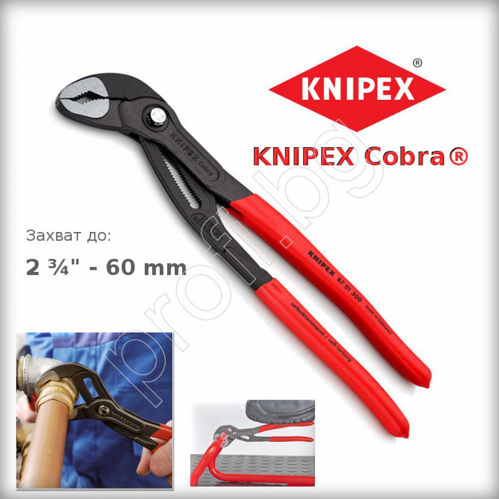 Клещите КОБРА захващат здраво и сигурно без изплъзване дори при затруднени условия. Специалната форма на захващащите площи и конструираните срещу посоката на въртене закалени зъби гарантират сигурна работа. С уникален механизъм клещите КОБРА могат да се настройват върху заготовката с натискането на бутон. Край на мъчителното изпробване за намиране на правилната настройка. Поставете горната челюст върху заготовката, натиснете бутона и придвижете долната челюст към нея. Гениално и просто. Шарнирният болт зацепва сигурно, дори под натоварване не е възможно неумишлено преместване. Благодарение на фината настройка винаги се постига благоприятно за захващане положение на рамената на клещите. И в това отношение КОБРА са много удобни за потребителя.