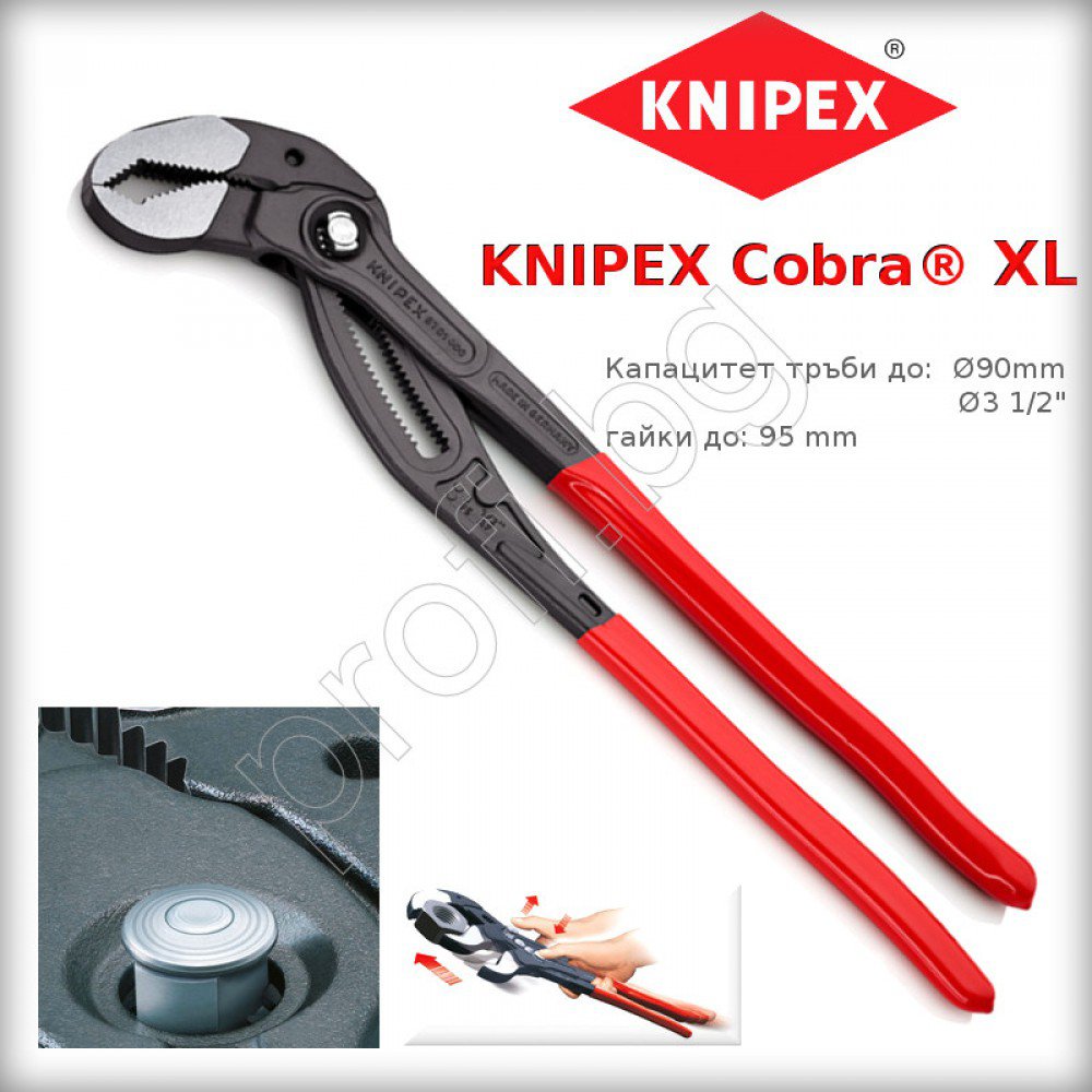 Клещите КОБРА захващат здраво и сигурно без изплъзване дори при затруднени условия. Специалната форма на захващащите площи и конструираните срещу посоката на въртене ,специално закалени зъби гарантират сигурна работа . С уникален механизъм клещите КОБРА могат да се настройват върху заготовката с натискането на бутон. Край на мъчителното изпробване за намиране на правилната настройка. Поставете горната челюст върху заготовката, натиснете бутона и придвижете долната челюст към нея. Гениално и просто. Шарнирният болт зацепва сигурно, дори под натоварване не е възможно неумишлено преместване Благодарение на фината настройка винаги се постига благоприятно за захващане положение на рамената на клещите. И в това отношение КОБРА са много удобни за потребителя.