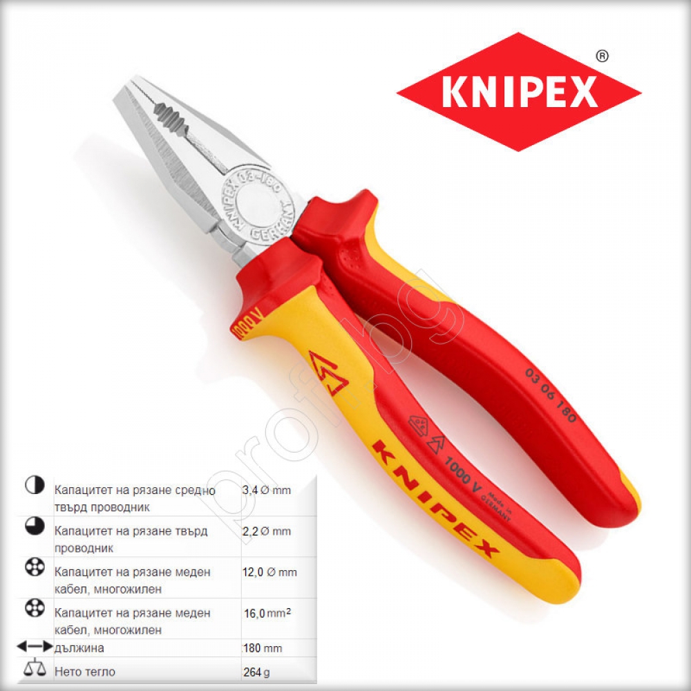 Комбинирани клещи с високоволтова изолация KNIPEX от висококачествена инструментална стомана, ковани и закалени в маслена баня. Удобни ръкохватки с двукомпонентно покритие против изплъзване.