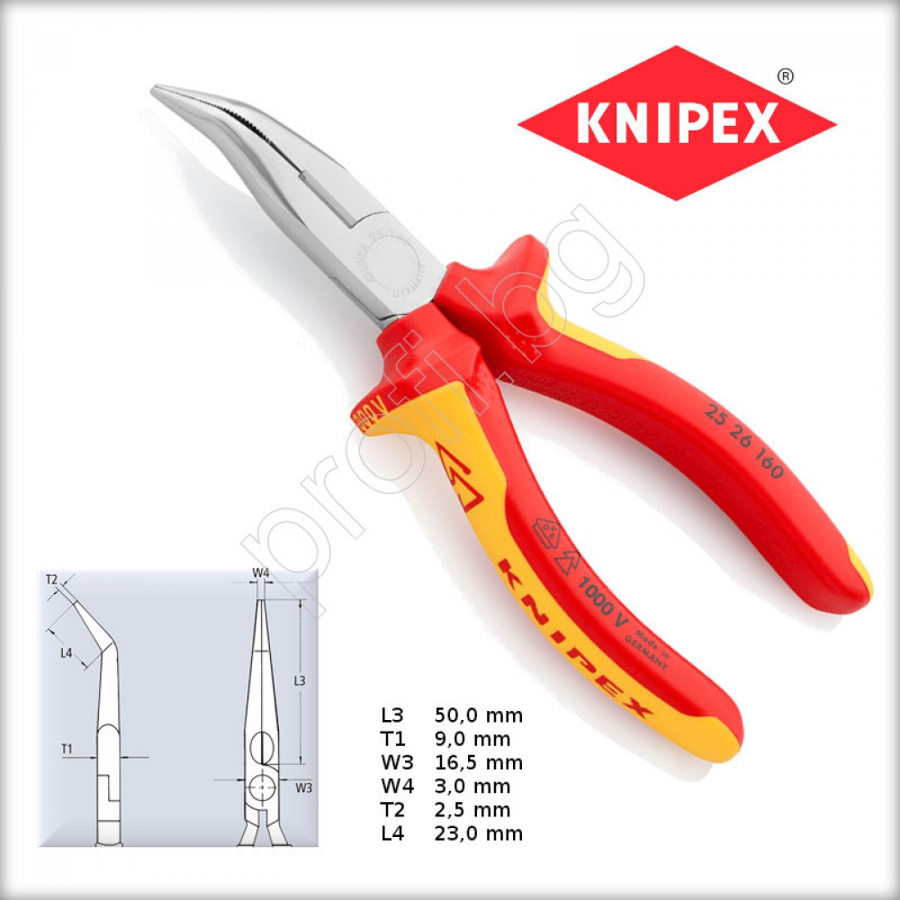 Клещи KNIPEX с полуобли челюсти под ъгъл 40°, Удобни ръкохватки с високоволтова изолация и двукомпонентно покритие против изплъзване. Подходящи за хващане и рязане във фината механика. Изработени от специална стомана закалени в маслена баня. Режещи ръбове допълнително закалени до 61 HRC.