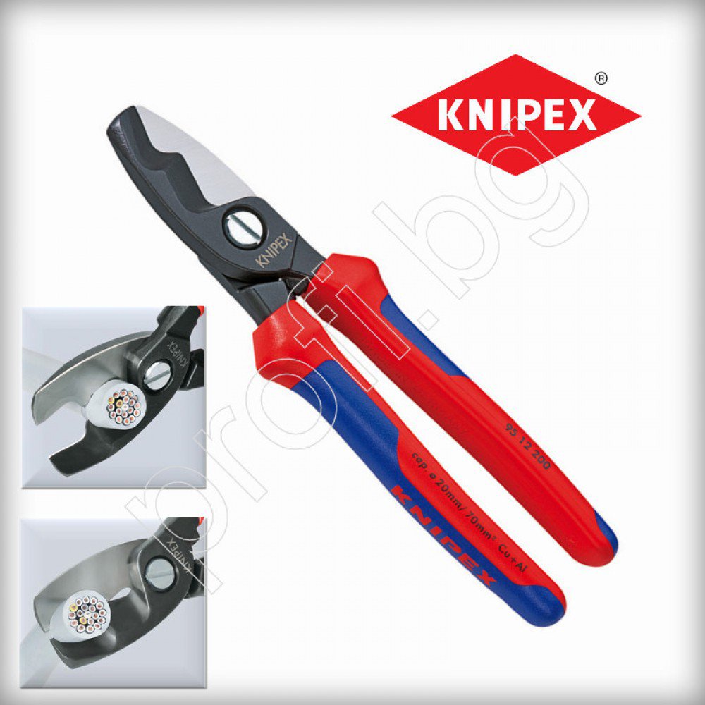 Клещи KNIPEX за рязане на алуминиеви проводници - единични кабели и сноп. Срезът е чист и гладък, без деформации. Подходящ инструмент за работа с една ръка. С двукомпонентна ръкохватка.