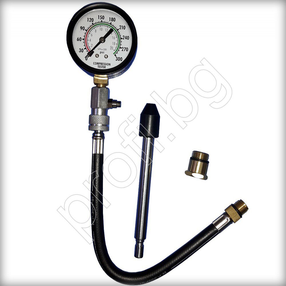 Бензинов компресомер. Използва се при всички автомобили с бензинови двигатели за бързо и лесно откриване на проблеми с клапаните, буталните сегменти, стените на цилиндрите и гарнитурите.