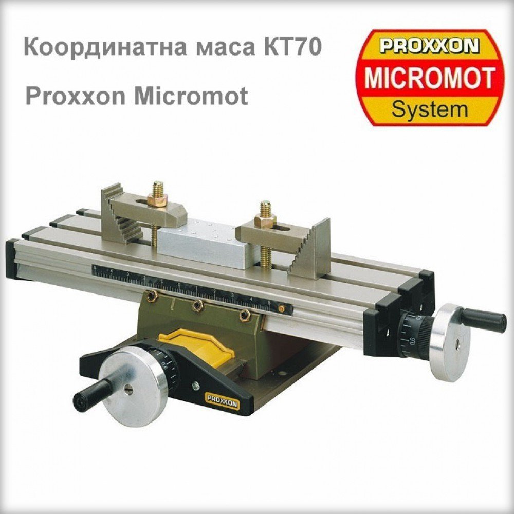 Координатна маса PROXXON MICROMOT КТ70 - стабилна и устойчива, изработена от твърд алуминий със специално обработена повърхност. Има регулатор за отстраняване на луфта и три Т-образни канала по стандарта на PROXXON MICROMOT - 12 х 6 х 5 мм. Подвижната скáла спомага за позиционирането на обработваните детайли. Подвижните нониуси са градуирани: 1оборот = 1мм; 1 деление=0,05мм. Стоманените фиксатори са включени в окомплектовката. Виж още