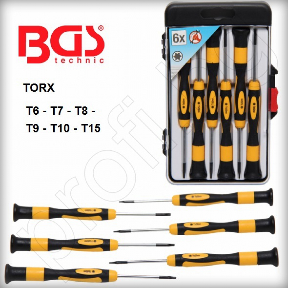 Комплект прецизни отвертки 6 бр. TORX Размери: Т6 - Т7 - Т8 - Т9 - Т10 - Т15; L 50 mm - работна част от хром-ванадиева стомана - хромирани остриета с магнитни, черни върхове - удобни ръконватки с въртящи се капачки - отвертките са подредени в пластмасова кутия