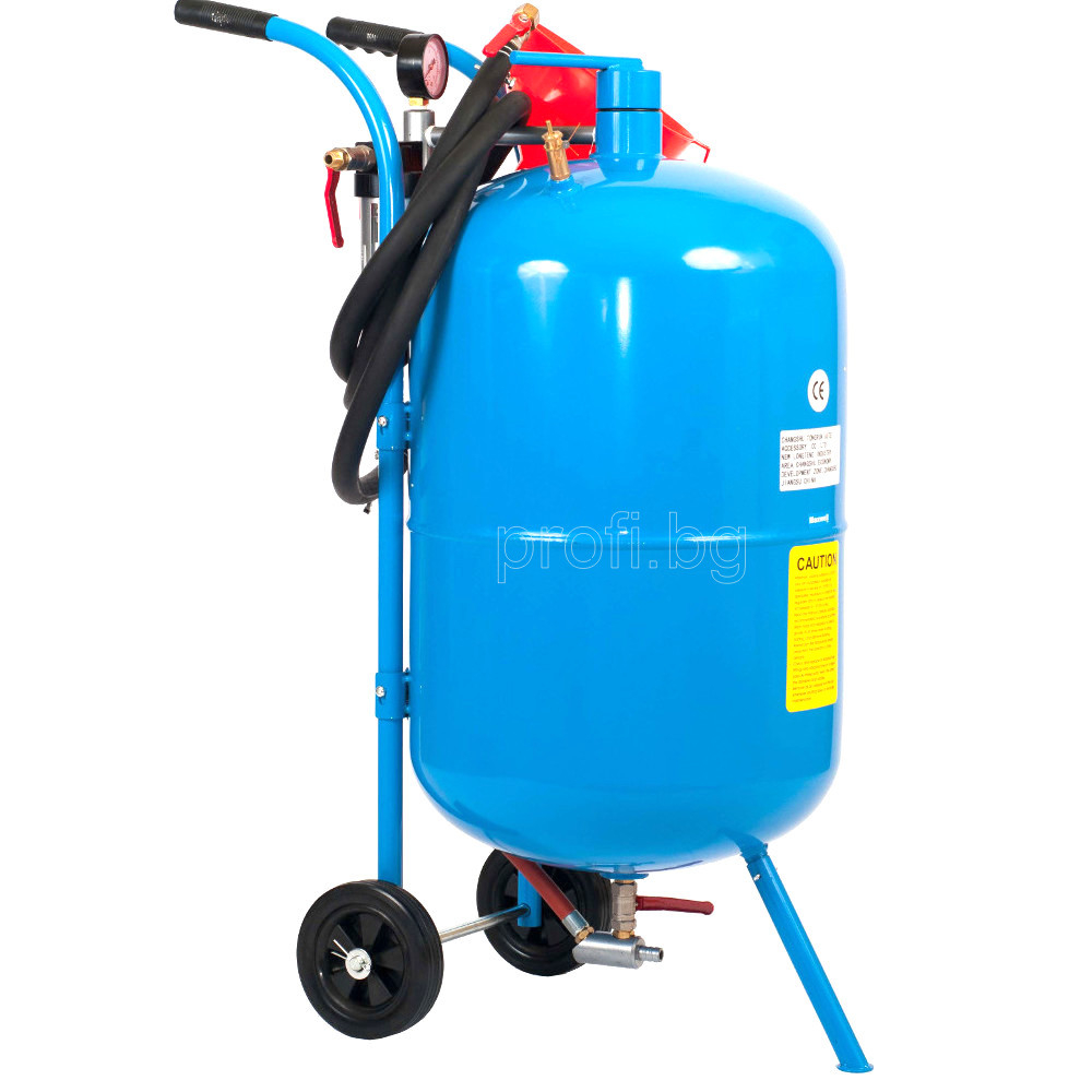 Пясъкоструйка мобилна пневматична даваща 30% повече пясъкоструйна сила от гравитачните такива. Оборудвана с комплект дюзи, затварящ клапан, манометър, фуния за пълнене, маркуч и защитна маска.