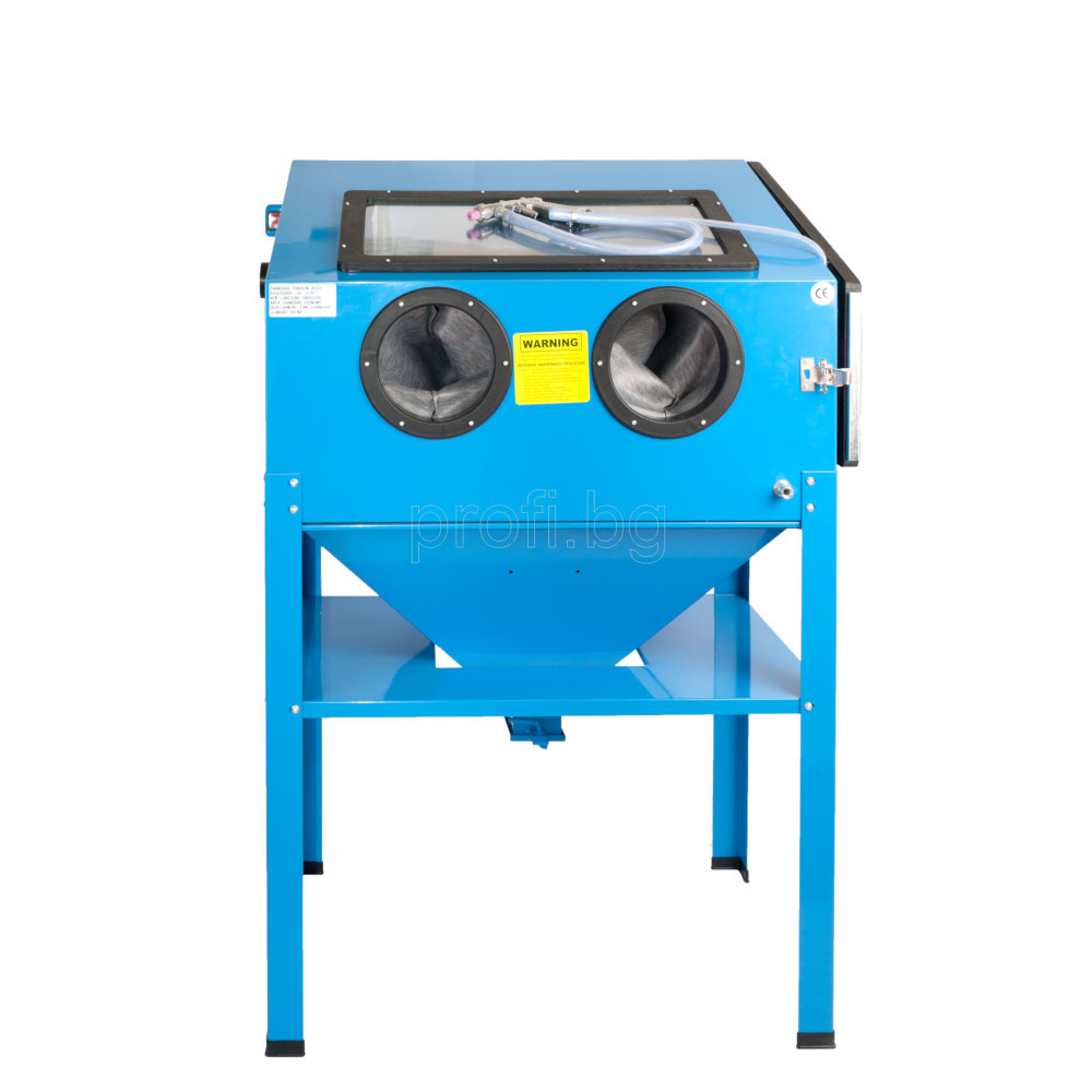 Пясъкоструйна камера оборудвана с пистолет за пясъкоструене в комплект с 4 керамични дюзи, обезопасяващи протектори за прозореца защитни ръкавици и осветление.