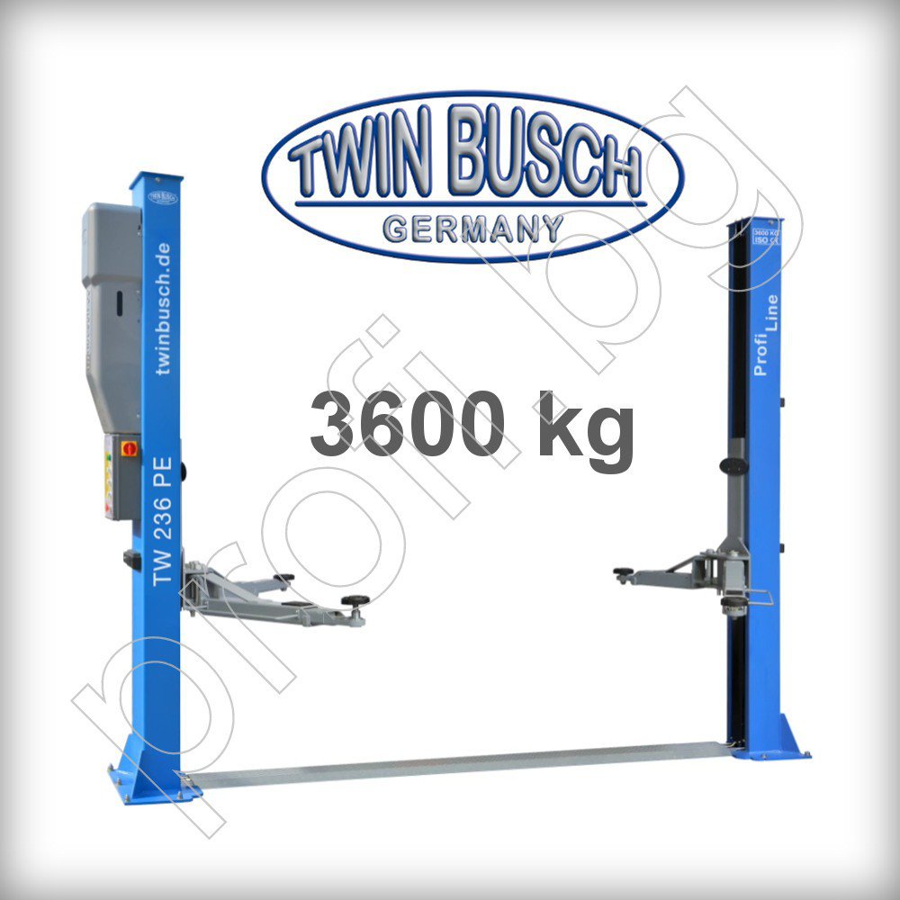 Подемник двуколонен 3,6t Profi-Line долна синхронизация, електрохидравличен с електромагнитно освобождаване на заключващия механизъм. Автоматичен ел.изключвател при достигане на максимална височина на повдигане.