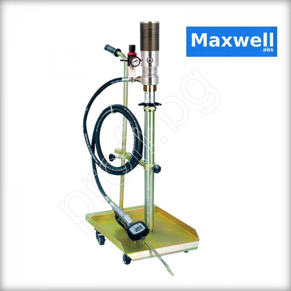 Помпа за наливане на чисто масло с максимален вискозитет SAE150, окомплектована с дигитален пистолет-разходомер, свързващ маркуч с кербовани накрайници и количка за варели до 60 кг.
