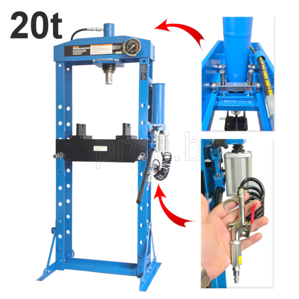 Преса 20t пневмо хидравлична с прецизно ролково позициониране на работния цилиндир в хоризонталната равнина и висококачествена пневматична помпа за управление на хидравличния възел.