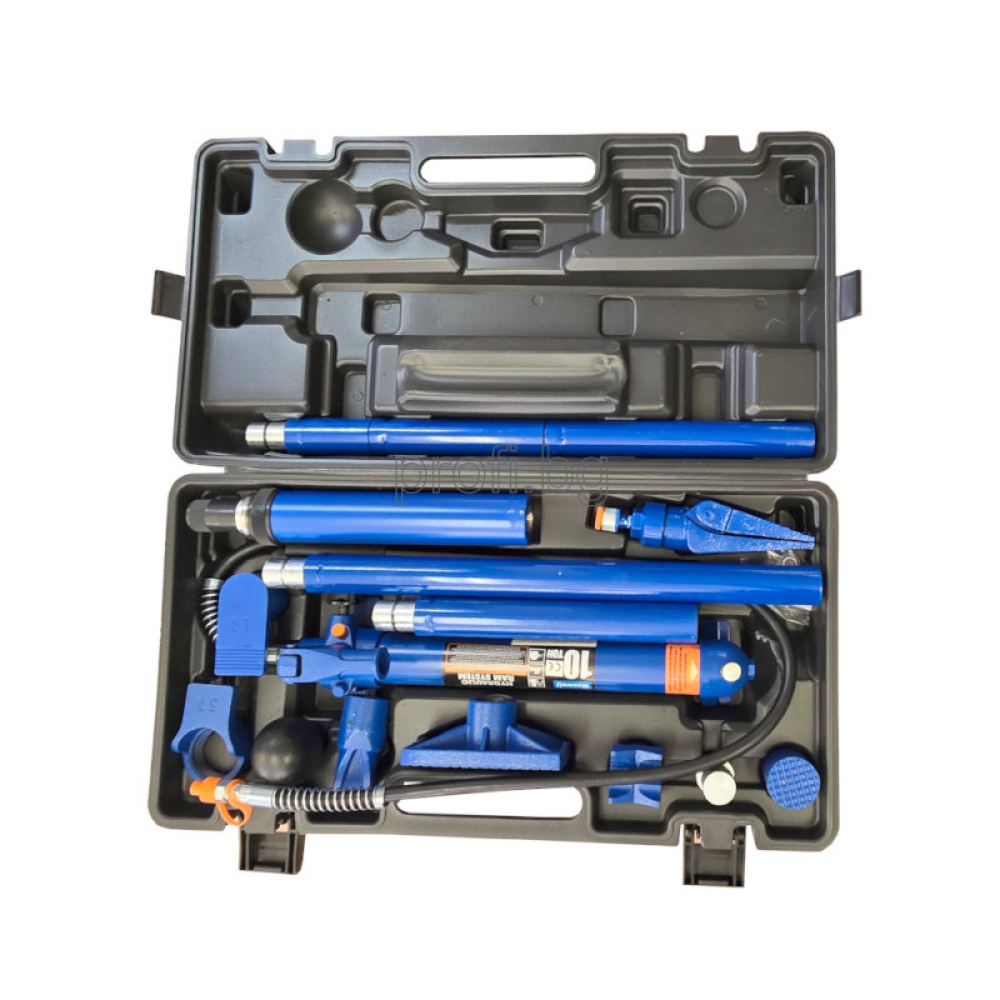 Комплект за разпъване на автомобилни купета в областта на двигателния, багажния отсек и др. Полезен и необходим инструмент дори и при работа със сериозни маси и съоръжения за разпъване. Налягане на помпата до 10 тона Тегло: 31 / 36 kg
