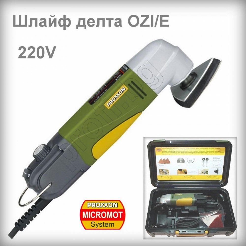 Мини делта шлайф OZI/E PROXXON MICROMOT предназначен за работа по труднодостъпни места като ъгли, ръбове, краища и др. Електронното регулиране осигурява подходящата скорост за всеки материал. Делта-шлайфът е в комплект с 1бр. нож за рязане 14mm и по 10 бр. абразивни триъгълни листи с едрина на шкурката Р80, Р150 и Р240, всичко в практичен пластмасов куфар. Шлифовъчната площ е 65/65/65мм, абразивните подложки могат да се сменят лесно и бързо, позволявайки да се използват и трите ъгъла. Отделно шкурки и остриета за рязане може да видите тук.