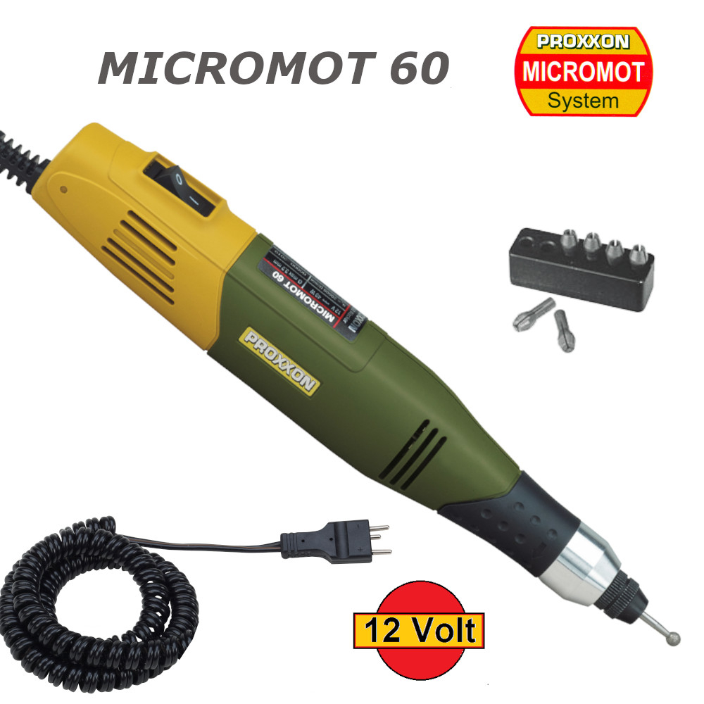 Дрелка - шлифовалка PROXXON MICROMOT 60 е предназначена за фрезоване, пробиване, полиране, рязане, шлайфане, гравиране и др. Тя е идеален инструмент за сглобяване на модели, за дърворезба, за работа в областта на електрониката и оптиката. Подходяща за бижутери, художници, скулптори, зъботехници и т.н. Работи тихо, без вибрации и с удължени интервали на работа. Корпусът, изработен от полиамид и подсилен с фибростъкло, благодарение на своите само 35мм диаметър и общо тегло на шлифовалката 230г, правят работата Ви изключително лека и прецизна. Шийката е с диаметър 20 мм, което позволява монтирането на машинката на стойки и държачи на PROXXON MICROMOT /виж стойка за дрелка, държач универсален/. Подходяща за използване на гъвкав вал.Тройноразцепените цанги, изработени от закалена стомана, гарантират прецизно закрепване на работния накрайник. Ниският волтаж (12V DC) и 40W номинална инсталирана мощност гарантират оптимално ниво на безопасност. При работа с уреда е необходим трансформатор! Препоръчваме употребата на трансформатор за напрежение MICROMOT с номинал от поне 1,0А /виж адаптер NG2/E , адаптер NG2/S