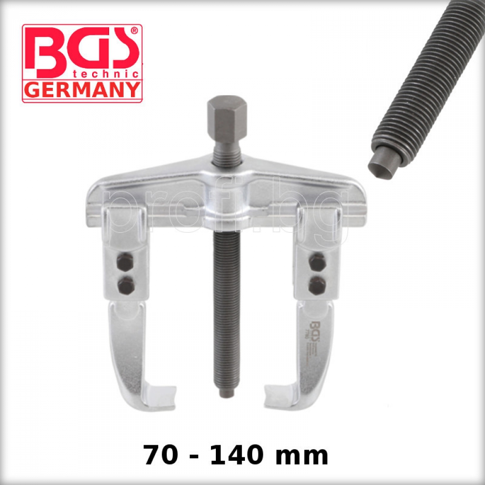 Скоба за лагери две регулируеми рамена за външно и вътрешно изтегляне. Ширина на външния диапазон 70 - 140 mm Макс. ширина на затягането 90 mm Дълбочина на затягане 100 mm Тегло 1,055 kg