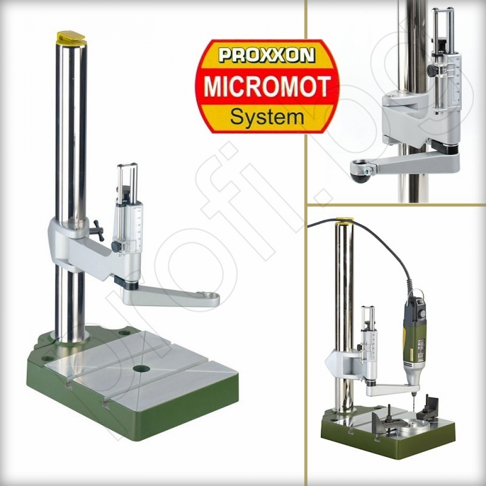 Стойка за бормашина с подвижно по хоризонтал рамо и захват на шийката 20мм. Поставената върху рамото бормашина може да се движи в хоризонтална посока по цялото работно поле, при което винаги остава в точно вертикално положение. По този начин пробиването винаги ще бъде абсолютно перпендикулярно спрямо работната повърхност. Дълбочината на пробиване се регулира по скáла. Регулируема пружина автоматично повдига бормашината в изходна позиция след пробиването. Устойчива основа с размери 200х200 мм, фрезована с два Т-образни слота. Вертикална стойка Ø 45мм и височина 500мм.