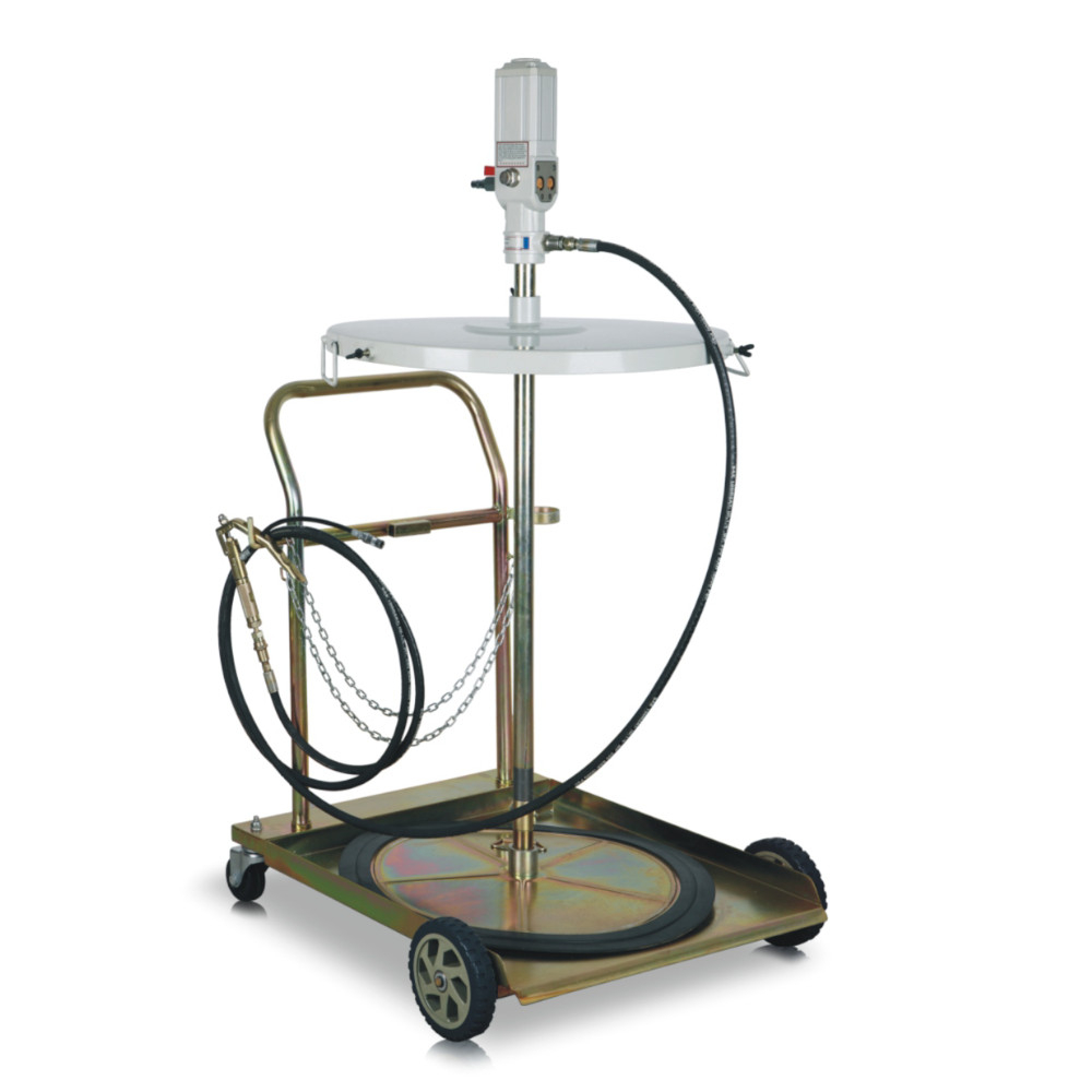 Пневматичен такаламит за грес варели 50-60 кг оборудван с помпа, маркуч и пистолет за гресиране инсталиран върху количка.