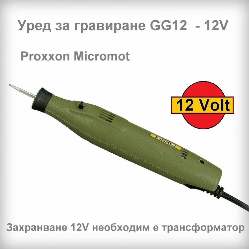 Уред за гравиране GG12 PROXXON MICROMOT е предназначен за гравиране върху стъкло, керамика или метал. Корпусът е изработен от полиамид, подсилен с фибростъкло. Накрайниците се поставят в гравьорката чрез напъхване с малки клещи или пинсети. Гравьорката се предлага и във вариант с кутия в комплект с работни накрайници виж тук.