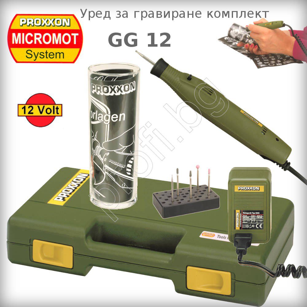 Уред за гравиране GG12 PROXXON MICROMOT в комплект с чаша за проба и упътване за работа, адаптер 12-18V и работни инструменти: димантени фрезери със сферична глава – 1,0 и 1,8 диаметър за материали като стомана, стъкло, керамика, порцелан и пластмаса; силиконово-карбидни конусообразни инструменти за матиране на стъкло и керамика; корундови фрезери с топчеста и цилиндрична форма. Накрайниците се поставят в гравьорката чрез напъхване с малки клещи или пинсети. Комплектът е опакован в удобна и практична пластмасова кутия. Гравьорката се предлага и самостоятелно - виж тук - арт.28592. Корпусът е изработен от полиамид, подсилен с фибростъкло, лек и удобен за работа с една ръка.